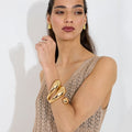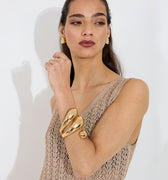 Förvandla din look med denna slående och skulpturala armring som inte är något mindre än ett konstverk för handleden. Denna cuff är designad för den moderna kvinnan som vågar ta plats och göra ett oförglömligt intryck.